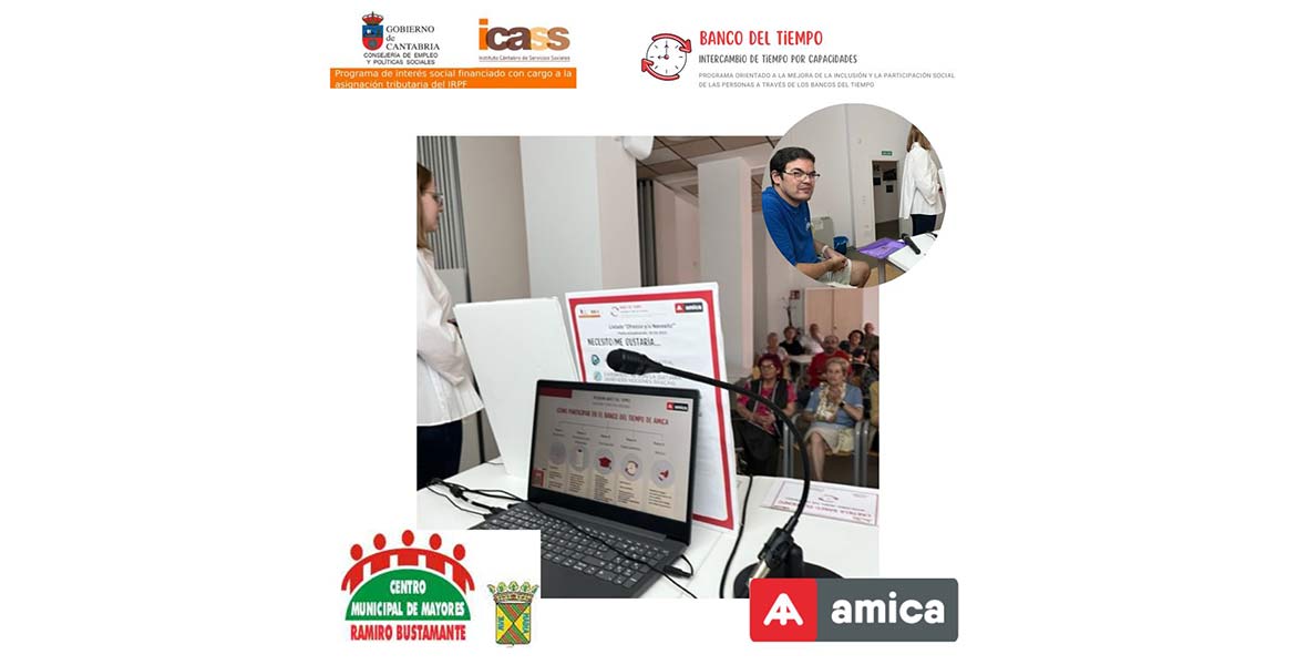 El pasado 12 de julio, Amica ha celebrado una charla sobre el Programa Banco del Tiempo: Intercambio de tiempo por capacidades para promover la participación y la inclusión social de las personas a través del Banco del tiempo, en el Centro de Mayores de Ramiro Bustamante de Torrelavega. Este programa está siendo posible gracias al Apoyo del Instituto Cántabro de Servicios Sociales (ICASS) del Gobierno de Cantabria.