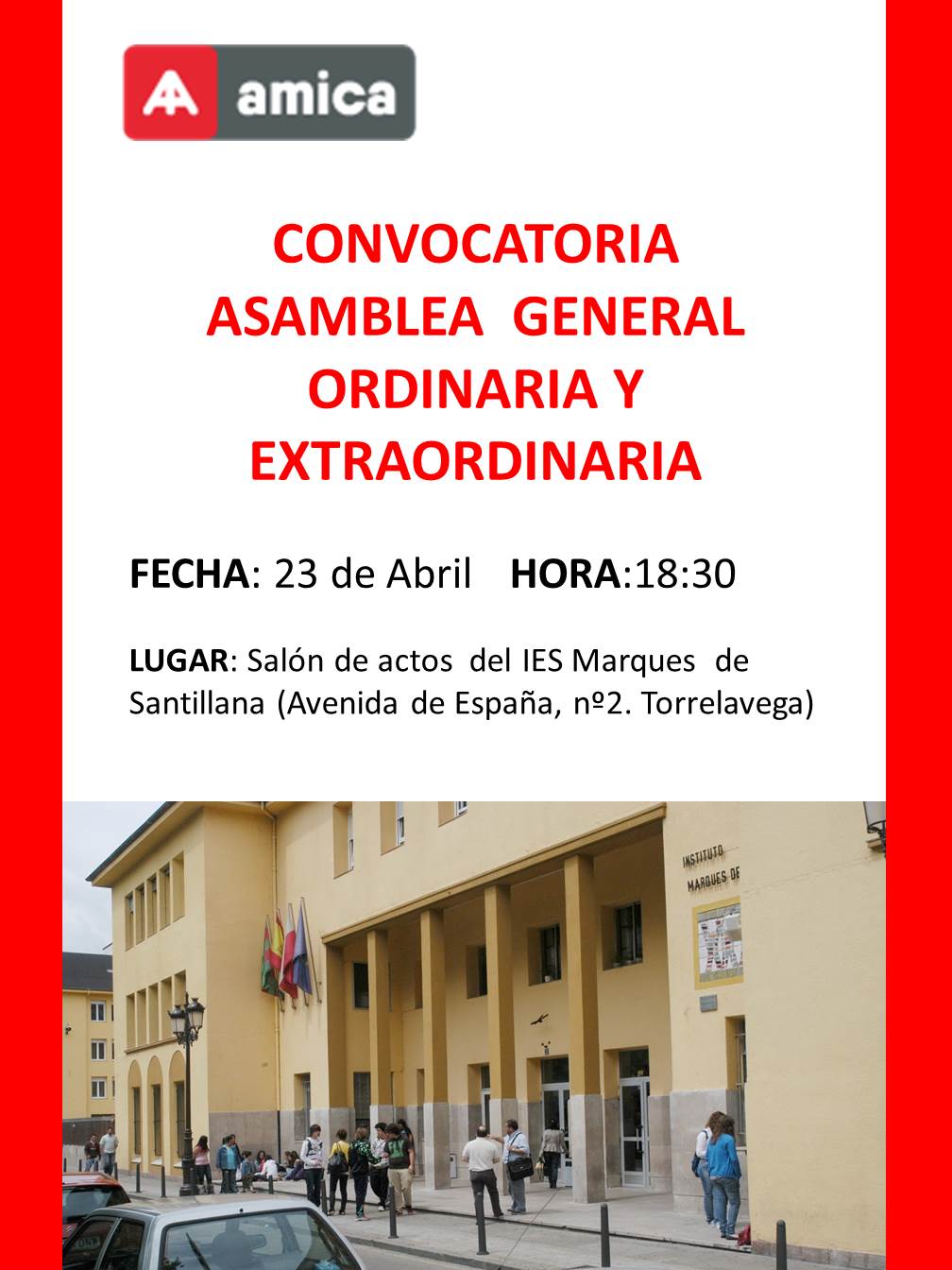 El próximo lunes 23 de abril a las a las 6:30 de la tarde vamos a celebrar la Asamblea General Ordinaria de nuestra Asociación, en segunda convocatoria en el salón de actos del IES Marqués de Santillana (Avenida de España, nº 2. Torrelavega.)
