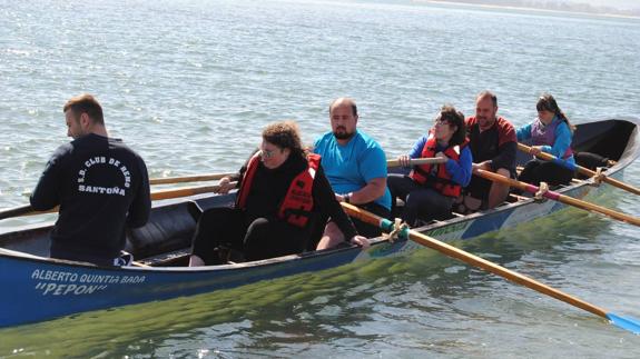 Hay sonrisas que no tienen precio y la de Bea, cuando con esfuerzo y superación, logró montarse por sí misma en la trainera en la que iba a salir a remar es impagable. La joven, usuaria del Centro de Día de Amica, en Santoña, disfrutó de lo lindo de la experiencia de practicar este deporte como una más en la bahía de su pueblo. No lo hizo sola. A la embarcación subieron otras dos compañeras. A Ángela le tocó estar en la popa y, al principio, no se encontraba muy segura. «Esto va a volcar», decía un poco preocupada. Mientras que Elsa, desde la proa, aplaudía aguardando el momento de salir a navegar con la ayuda de dos monitores. Ella tiene experiencia en eso de mover el remo. «También vine el año pasado», cuenta risueña. Y tiene razón.